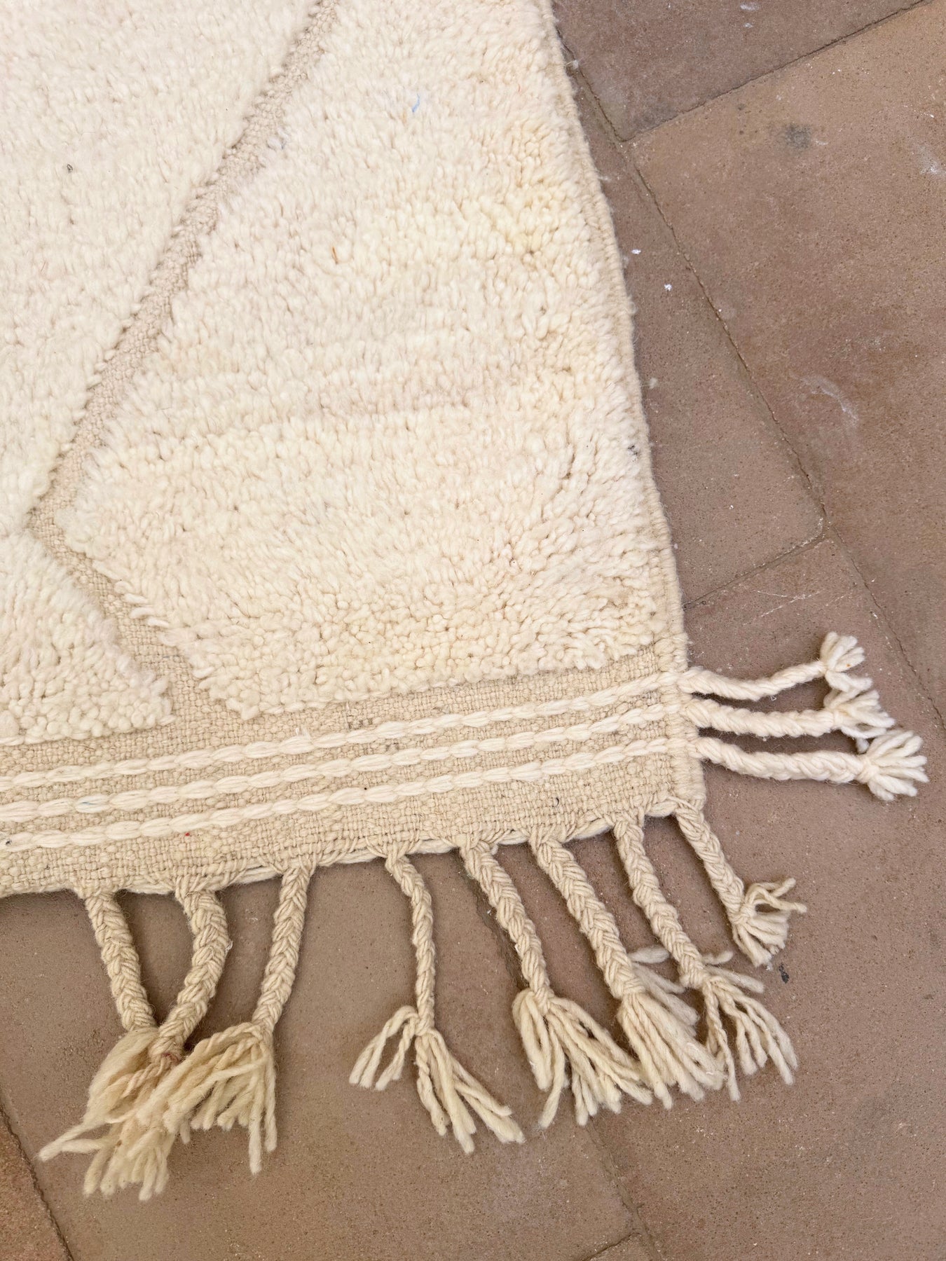 This Beni Ourain berber rug is handmade from authentic organic wool and natural dyes in the Middle Atlas Mountains of Morocco. It’s a medium pile carpet with simple design.